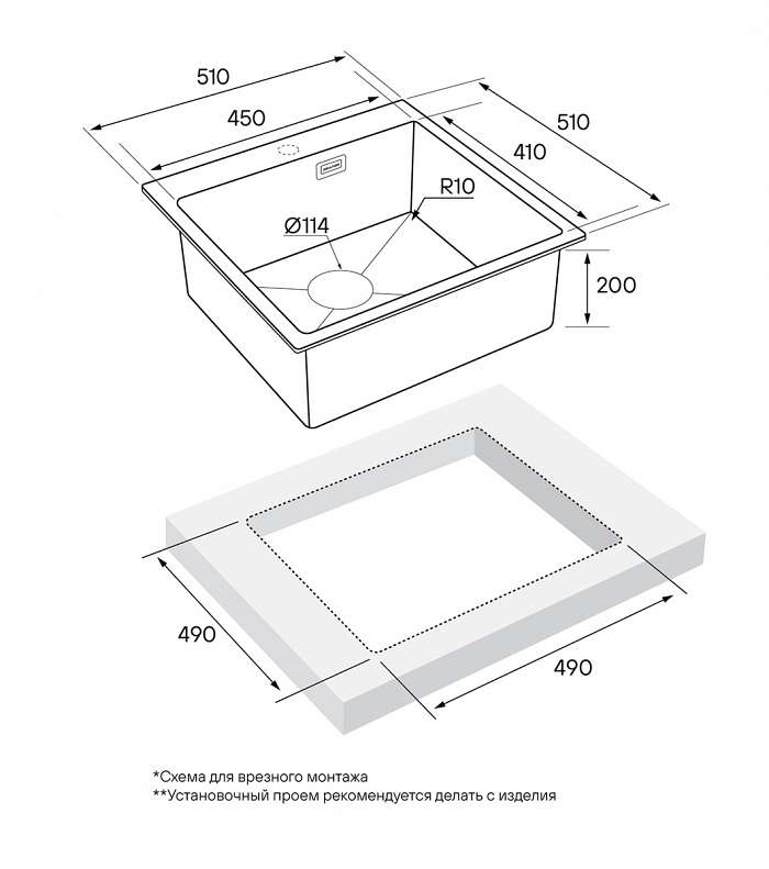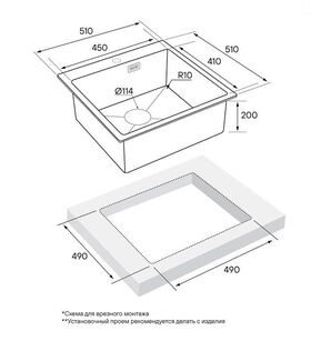 Монтаж в один уровень со столешницей / встраиваемый сверху / встраиваемый снизу