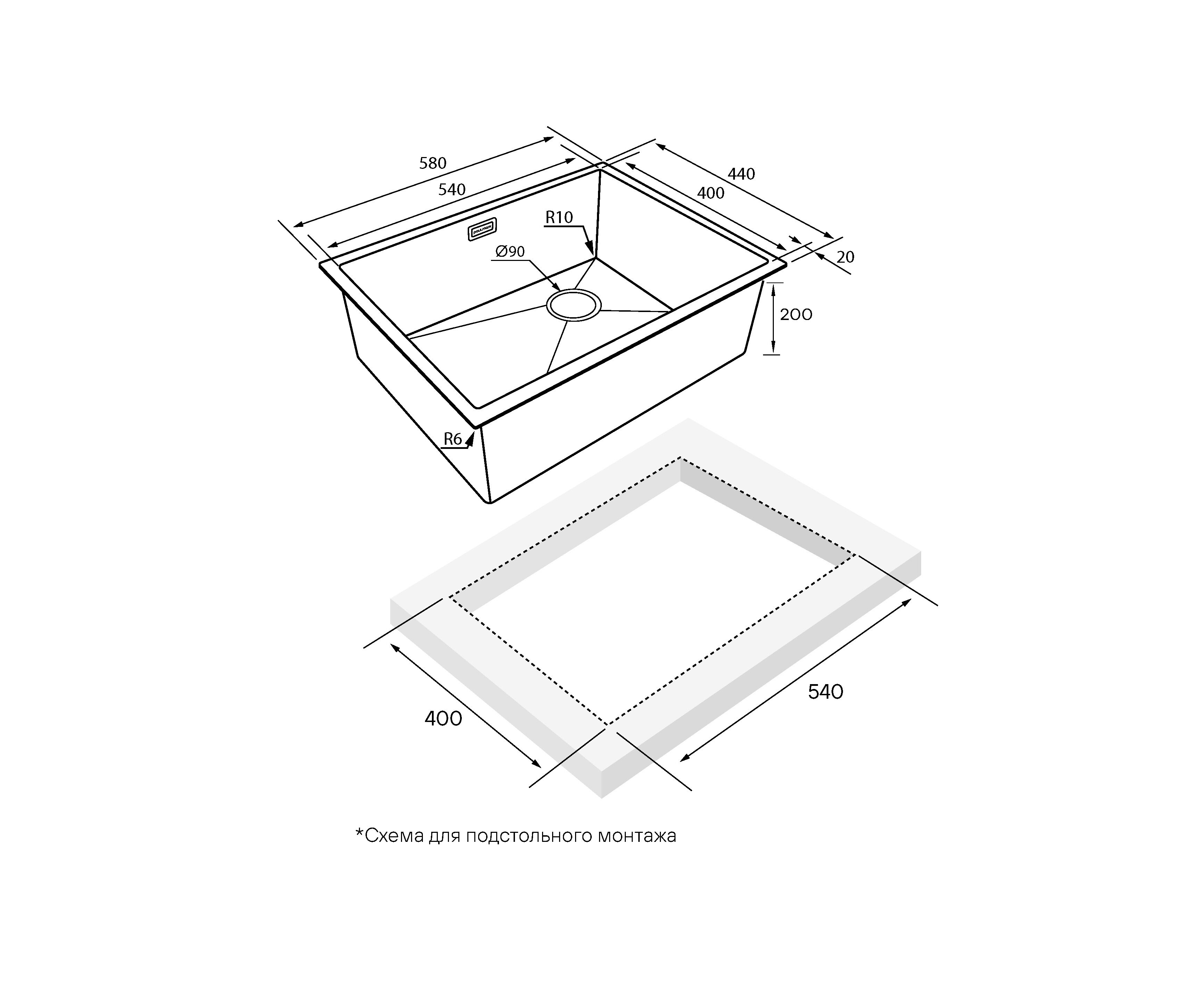 Монтаж в один уровень со столешницей / встраиваемый сверху / встраиваемый снизу