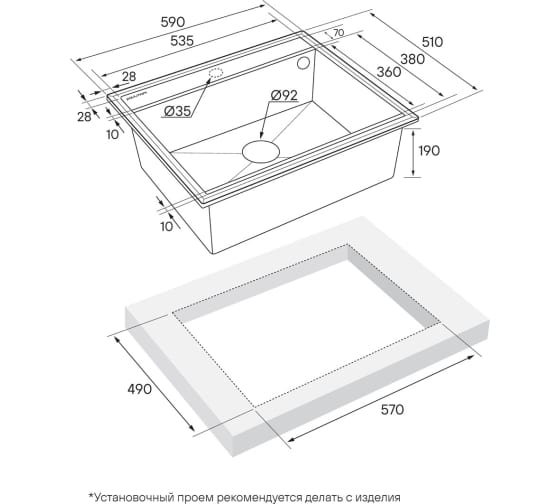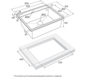 Внешние грани мойки были специально разработаны таким образом, чтобы мойка прилегала к столешнице максимально плотно, а переход края мойки к столешнице выглядел плавно и эстетично Дно чаши мойки имеет 4 грани направленных к сливу под индивидуальным градусом для максимального быстрого ухода воды.