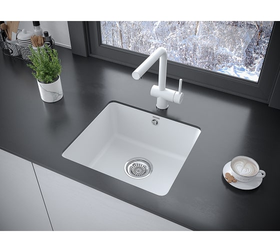 Кварцевая мойка для кухни UNTER PM204543-WH. Оптимальный размер 455х435мм идеально подойдёт для ограниченного кухонного пространства.