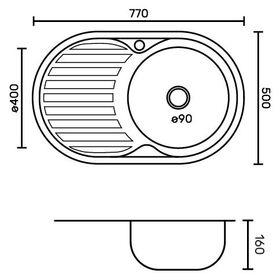 Габаритные размеры: ширина 770 мм, длина 500 мм, глубина 160 мм, толщина стали 0,6 мм.