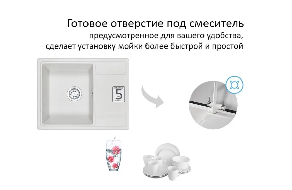 Готовое отверстие под смеситель, предусмотренное нами для вашего удобства, сделает установку этой мойки гораздо более быстрой и простой!