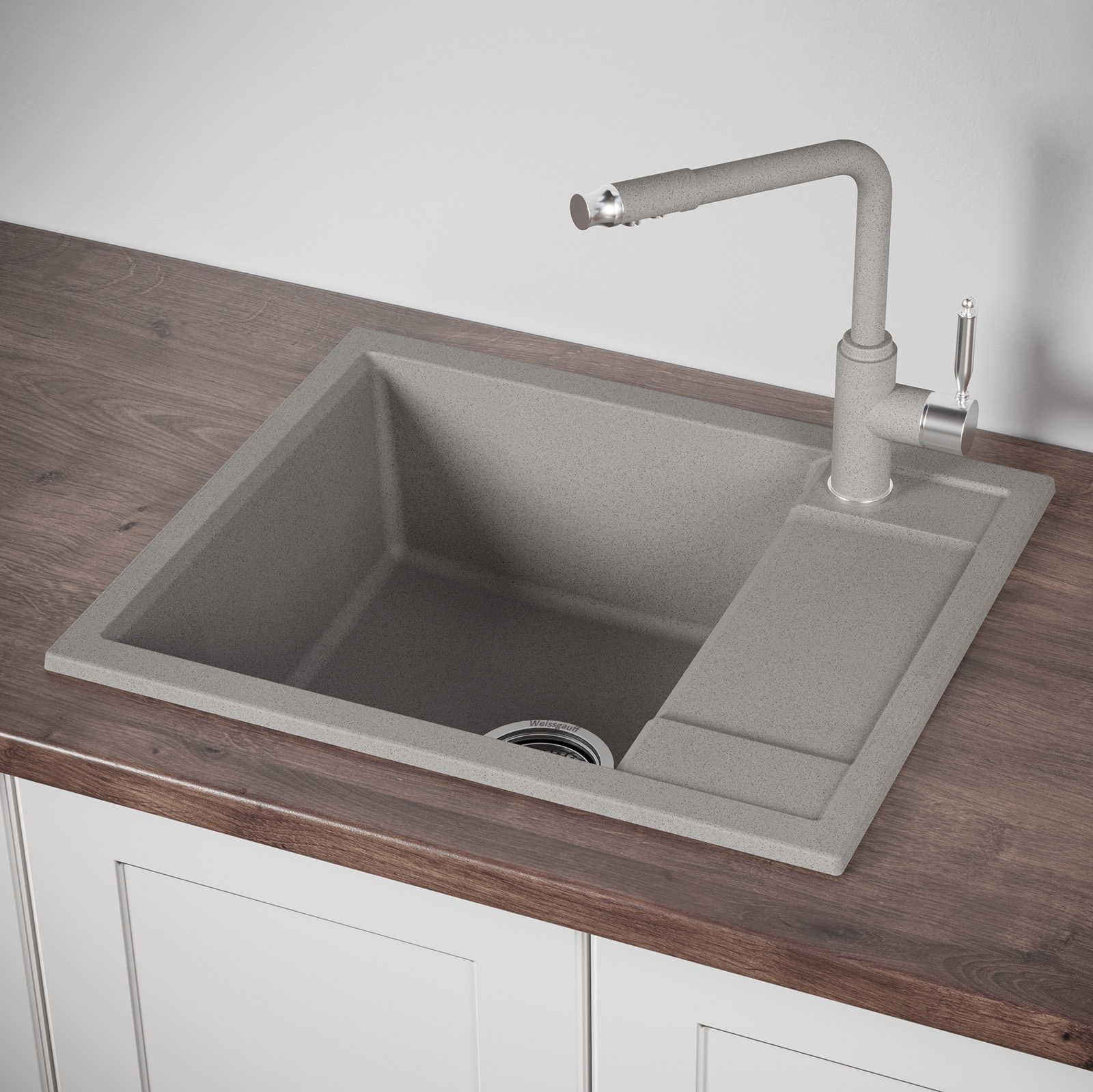 Кухонная мойка Weissgauff с чашей прямоугольной формы и особым эргономичным крылом, выполненная из высококачественного искусственного камня и предназначенная для накладной установки в кухонный шкаф шириной 50 см - это по-настоящему вместительная чаша при лаконичном дизайне!
