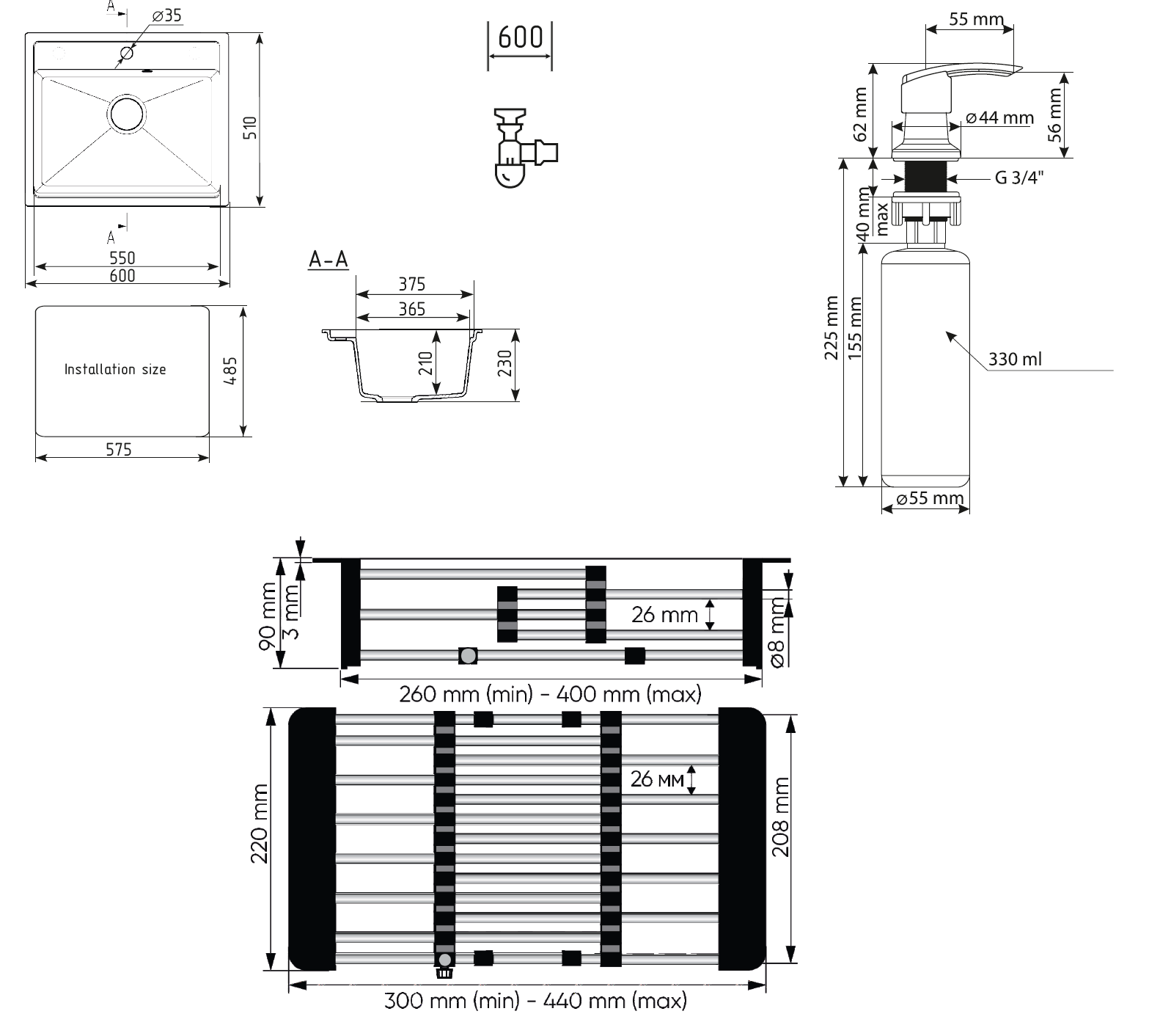 Комплектация: Мойка, сифон серии "Элит", гофротруба, коландер, дозатор, технический паспорт и гарантийный талон