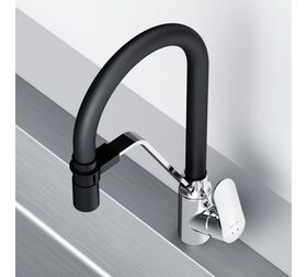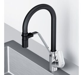 Гибкий излив значительно расширяет зону использования смесителя, гарантирует легкий уход за мойкой и наполнение емкостей любого размера. Устойчив к загрязнениям, перегибам и внешним воздействиям. Удобный магнитный притягиватель для фиксации излива.