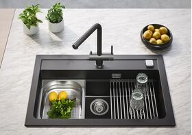 Высокий прямоугольный излив обеспечит удобство при работе с крупногабаритной посудой.