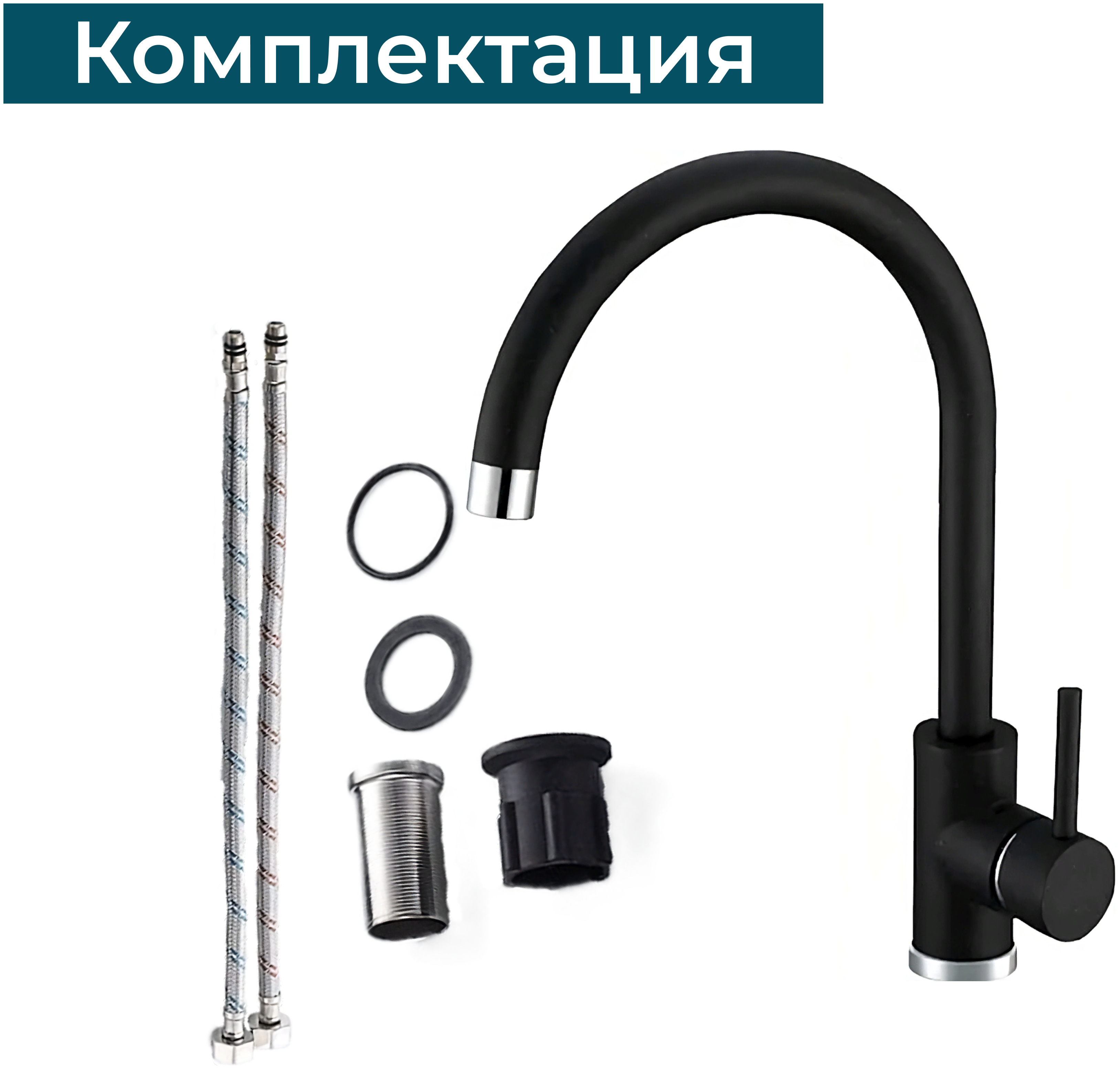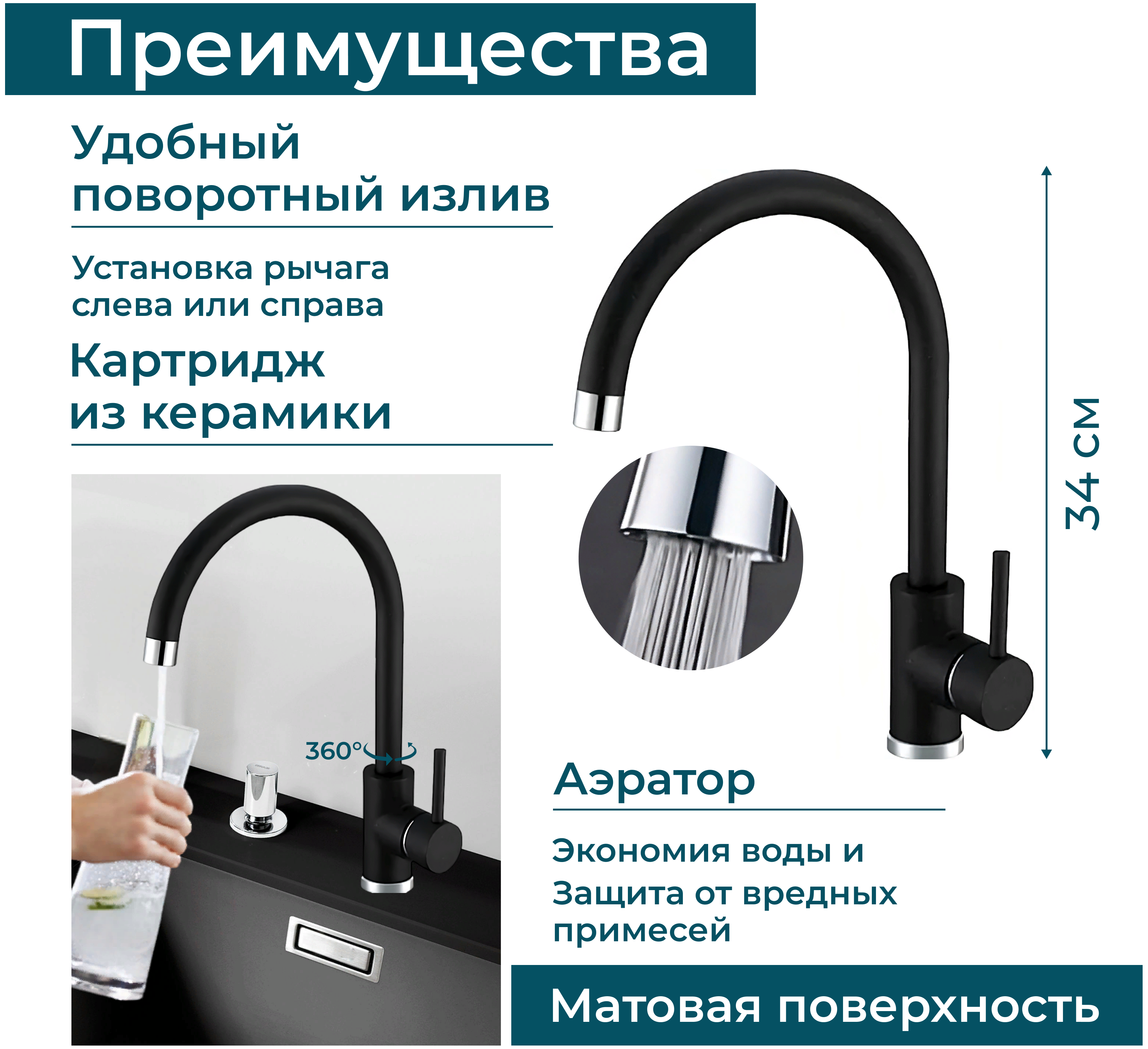 Высокий арочный излив, способный вращаться на 360 градусов, обеспечит комфорт при работе с крупногабаритной посудой.