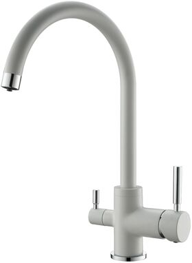 Высокий кухонный смеситель с подключением фильтра для питьевой воды. Выполнен в современном дизайне.