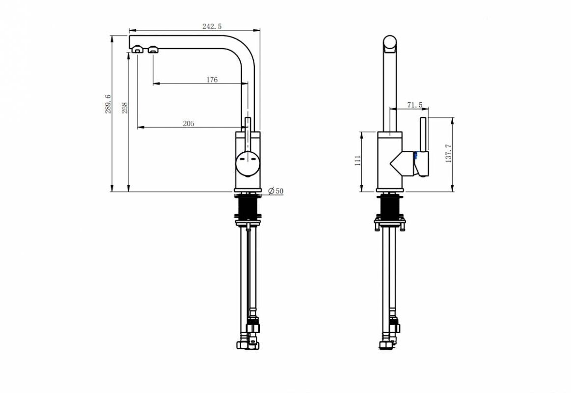 Удобное однорычажное управление подачей водопроводной и питьевой воды с плавным переключением.