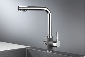 Смеситель — модель с краном для питьевой воды. Имеет удобные, эргономичные ручки и оптимальные для большинства кухонь размеры. Дополнительным плюсом является хромированный излив, сочетается с другими хромированными деталями на кухне.