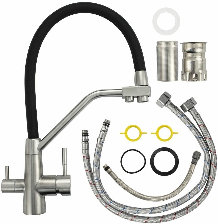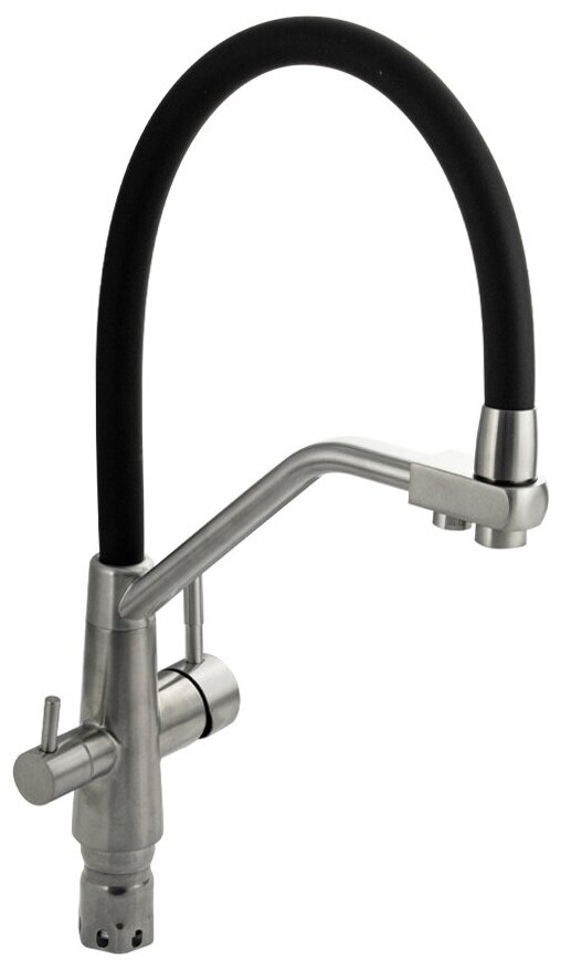 Смеситель для кухонной мойки и раковин с двойным выпуском воды для фильтра, литой матовый корпус, из нержавеющей стали марка 304, с высоким С-образным гибким изливом чёрного цвета с фиксацией на жёстком изливе, шаровый. Крепление резьба - гайка, картридж d = 40 мм, ручка шток. Аэратор для экономии воды. Такая модель может использоваться на домашней кухне, на даче, в медицинских учреждениях и общественных местах. Габаритные размеры: высота 430 мм, длина 280 мм, диаметр посадочного седла 47 мм, длина резьбы 60 мм, длина подводки 500 мм. Вес - 2,800 кг, объём - 0,01300 м3. В комплекте паспорт, корпус с изливом, подводка 1/2, крепеж, набор прокладок.