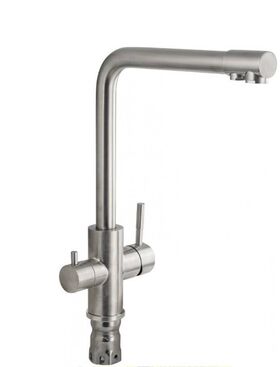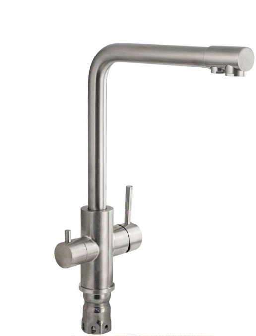 Смеситель для кухонной мойки и раковин с двойным выпуском воды для фильтра, литой матовый корпус, из нержавеющей стали марка 304, с высоким Г - образным изливом, шаровый. Крепление резьба - гайка, картридж d = 40 мм, ручка шток. Аэратор для экономии воды. Такая модель может использоваться на домашней кухне, на даче, в медицинских учреждениях и общественных местах. Габаритные размеры: высота 350 мм, длина 300 мм, диаметр посадочного седла 50 мм, длина резьбы 60 мм, длина подводки 500 мм. Вес - 2,44 кг, объём - 0,00900 м3. В комплекте паспорт, корпус с изливом, подводка 1/2, крепеж, набор прокладок