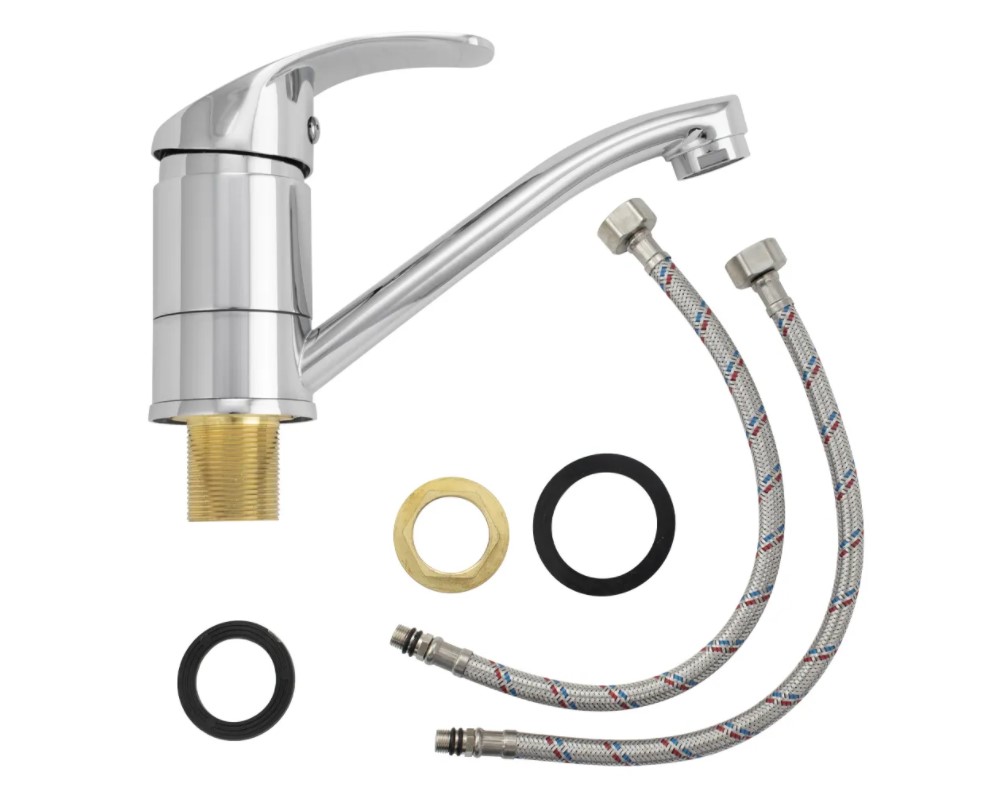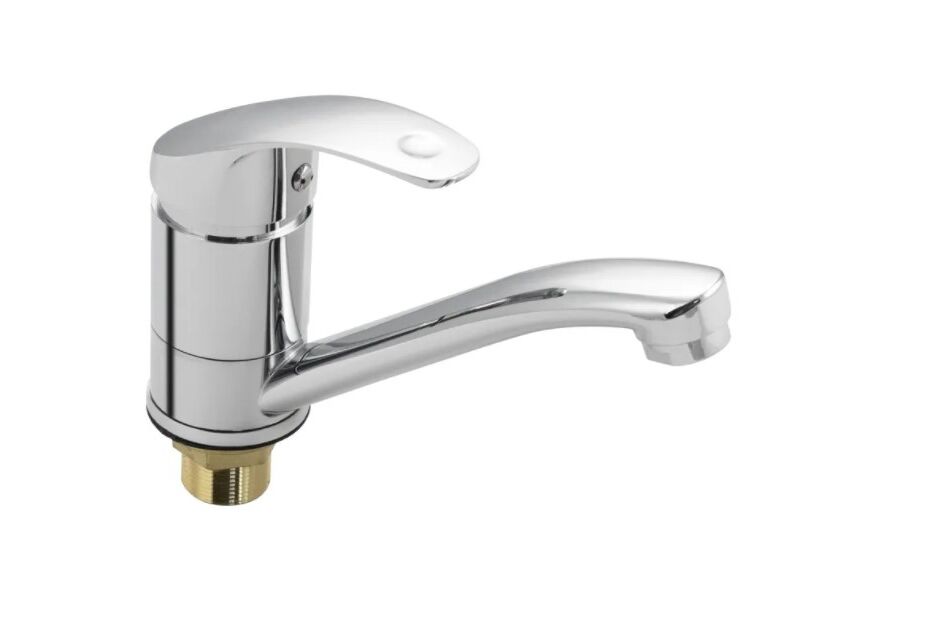 Смеситель для кухонной мойки и раковины, хромированный, с коротким, поворотным изливом, шаровый, литая ручка. Крепление резьба - гайка, картридж d= 40 мм. Аэратор для экономии воды.