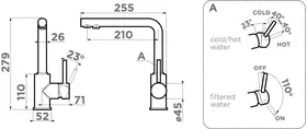 Современный кухонный смеситель с новой технологией системы ручки 3в1, которая позволяет переключить с водопроводной воды на фильтрованую в одно касание. Фильтрованная вода подается по отдельной трубке и имеет отдельный выход, что исключает возможность смешивания с водопроводной водой. Смеситель обладает высоким прямоугольным изливом, обеспечивающим максимально удобную работу с кастрюлями и другой габаритной посудой. Модель изготовлена из высококачественной латуни.