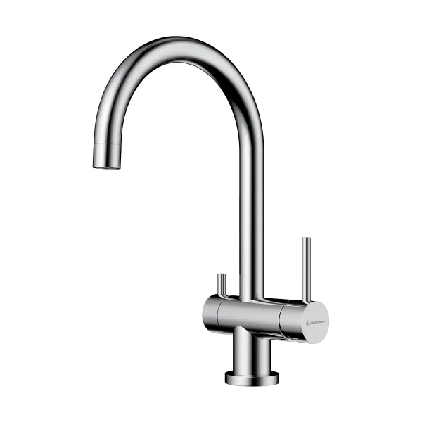 Смеситель для кухни Omoikiri YAMADA с высоким изливом для питьевой воды. Практичный модельный ряд 3 в 1: функция подачи холодной/горячей воды и возможность подключения фильтрованной воды. Вода, проходя через фильтры, подается по отдельной изливу трубочке в кран и не смешивается с водопроводной водой.