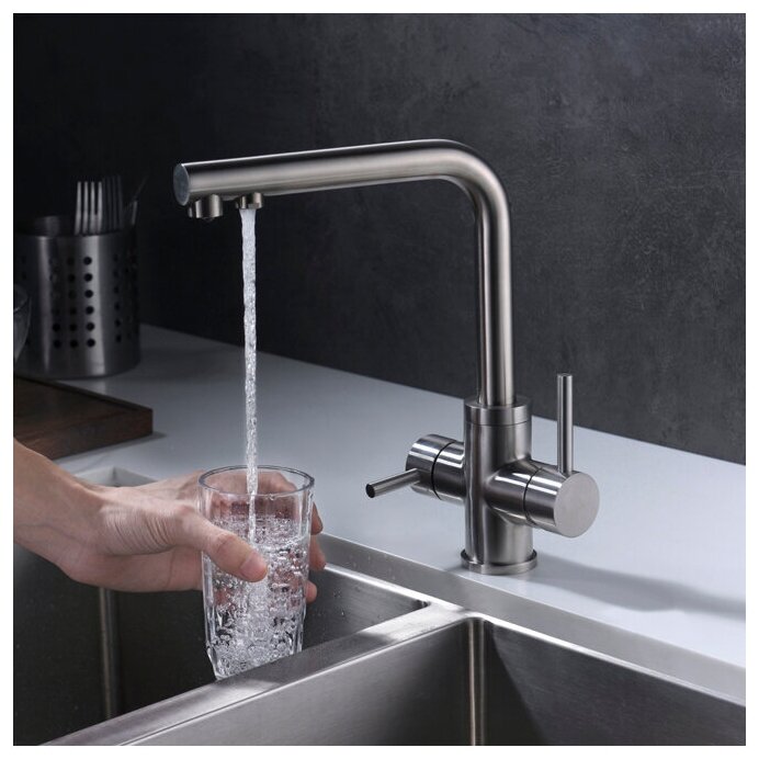 Кухонный смеситель с подключением к фильтру питьевой воды. Чистая вода подается из отдельного носика, снабженного аэратором. Смеситель имеет высокий излив, удобный для наполнения кастрюль и ваз. Выполнен из нержавеющей стали с покрытием Satin.