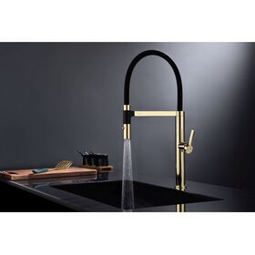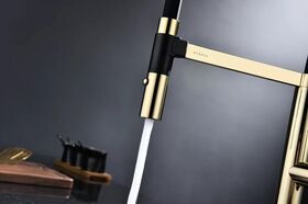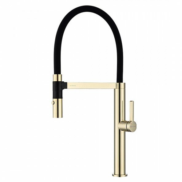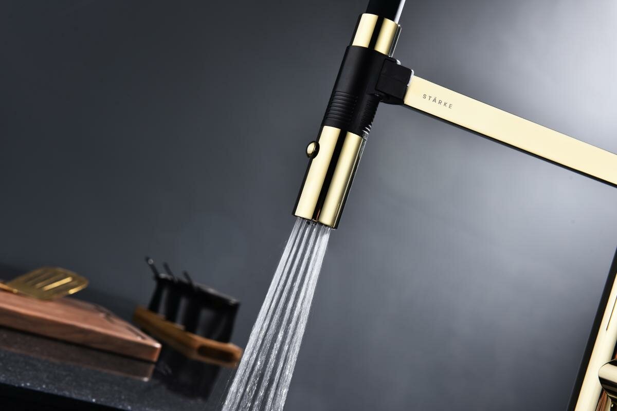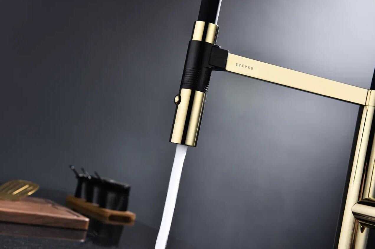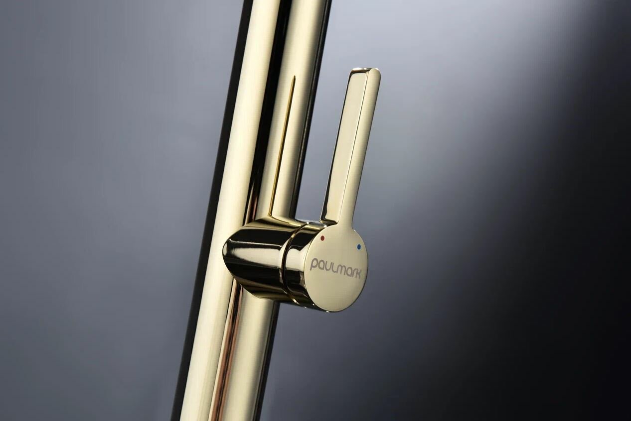 Смеситель для кухни LEADER в цвете "золото". Изготовлен из высококачественной латуни, которая отвечает высочайшим европейским стандартам качества, не содержит свинца, не разрушается со временем и безопасна для здоровья. Смеситель имеет два режима подачи воды: мощная струя и деликатный душ. Гибкий излив из силикона, способный на вращение 360 градусов обеспечивает оптимальный диапазон движения и удобство использования. Крепление гибкого излива с помощью магнитного держателя обеспечивает надёжную фиксацию. Современная форма идеальна для создания уникального дизайна вашей кухни. Гарантия на смесители Paulmark 5 лет.