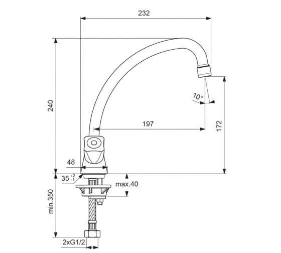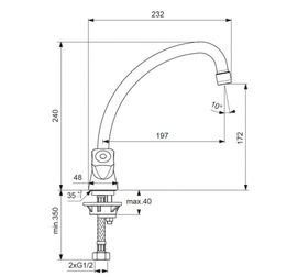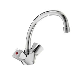 Смеситель для кухни VIDIMA Практик двуручковый BA231AA - это сантехнический прибор для подачи и регулировки температуры воды. Изделие монтируется на раковину. Конструкция оснащена поворотным изливом, двумя кран-буксами, подводкой и аэратором. Маховики выполнены из пластика. Корпус изготовлен из латуни, покрытой никель-хромом для защиты от коррозии.