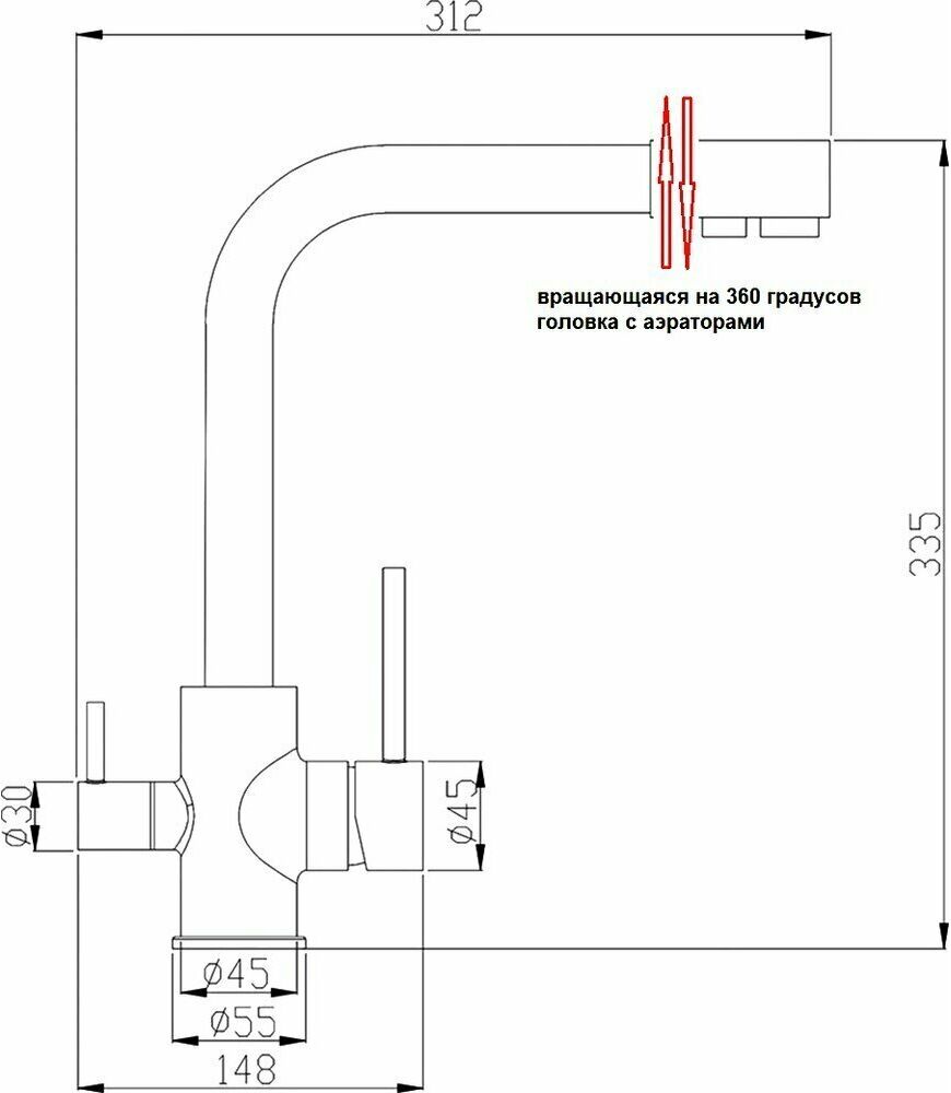 вращающаяся на 360 градусов головка с аэраторами; смеситель изготовлен из нержавеющей стали марки SUS 304, с краном для питьевой воды