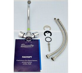 Двуручный смеситель Eleanti для мойки, с гибкой подводкой 0402.888 - это надежный латунный смеситель.. Он идеально подойдет к мойке и впишется в интерьер любой кухни. Кран смеситель для кухни ( для раковины ) сделан из латуни класса люкс (ЛС-59). В комплекте имеется гибкая подводка 35 см ( штуцер, ниппель из латуни ) и крепеж. Кран для кухни имеет поворотный высокий излив ( гусак ), у него есть аэратор для смесителя - насадка на кран для экономии воды. У смесителя надежные керамические кран буксы. Смеситель для мойки может использоваться и для дачи, а ещё как сантехника на кухню ( и даже на умывальник в ванную комнату).
