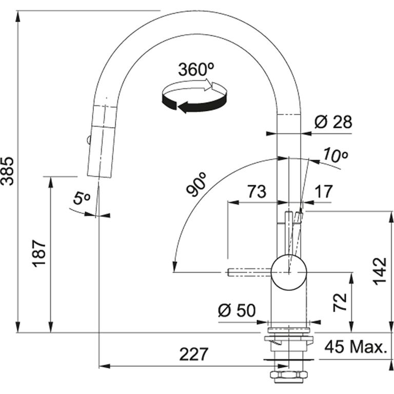 Излив оригинальной формы поворачивается на 360 градусов и выдвигается на армированном шланге для ополаскивания посуды или продуктов со всех сторон.