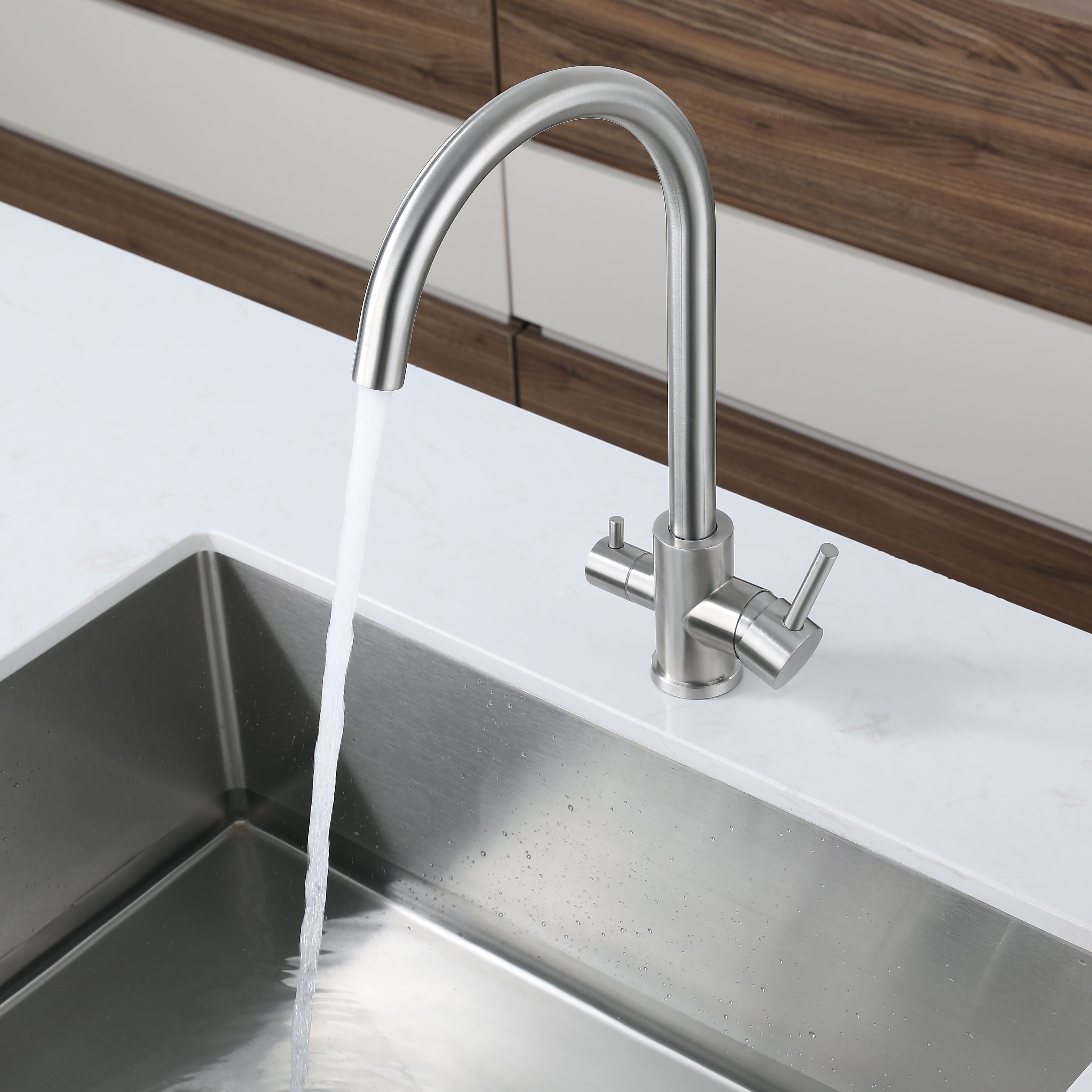Смеситель Z-5420 изготовлен из нержавеющей стали и прослужит Вам долгие годы. Поверхность смесителя окрашена в цвета кварцевых моек GranFest. Стильный и надёжный вариант прекрасно впишется в интерьер любой современной кухни. Смеситель оснащен: - краном с питьевой водой; - керамическим картриджем, диаметром 35 мм; - гибкой подводкой на 60см. Вращение излива позволит Вам удобно располагать его во время мойки посуды. в излив смесителя уже установлен аэратор, это экономит воду во время мытья, и сохраняет тишину.