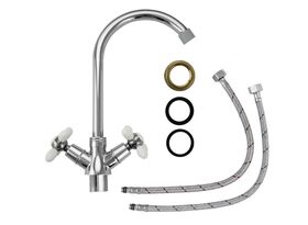 Смеситель кухонный серп и молот, металлокерамика, белые вставки на ручках и аэраторе, крепление на гайке, подводка, комплект прокладок.