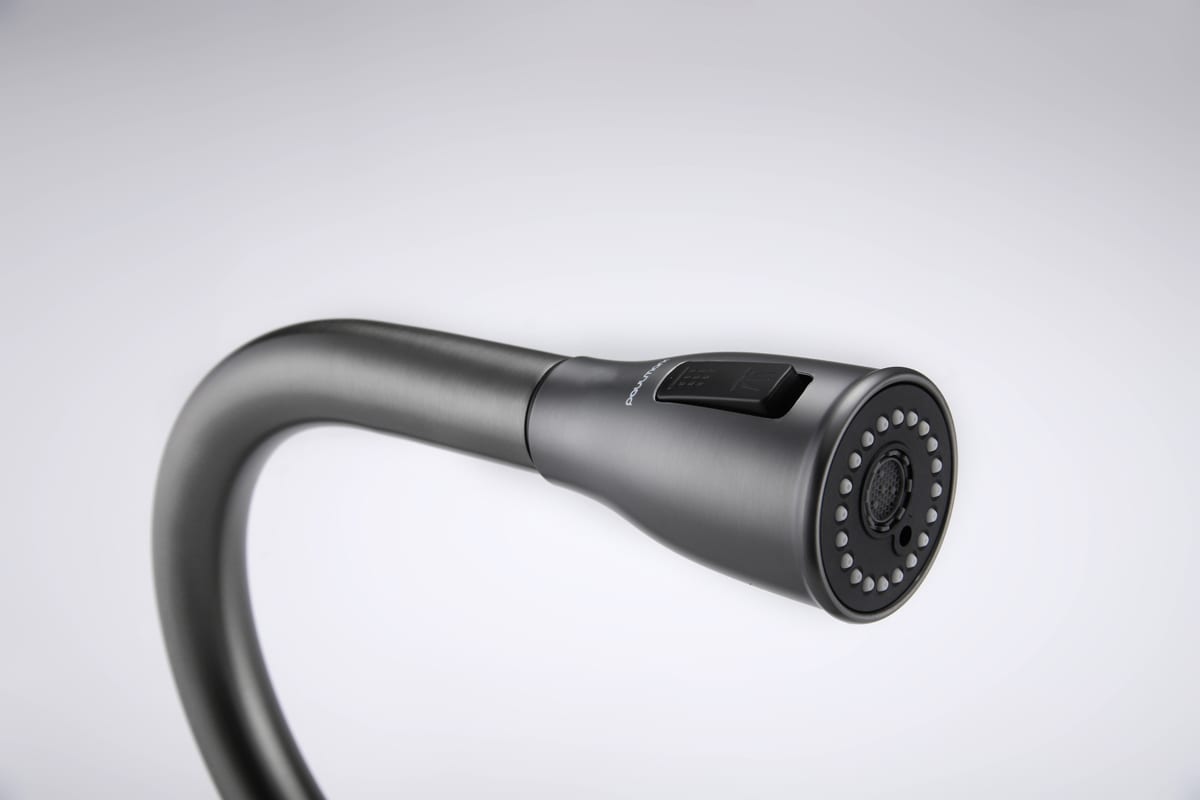 Конструкция смесителя с вытяжным шлангом значительно облегчает процесс мойки посуды или продуктов любого размера и формы.