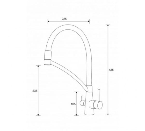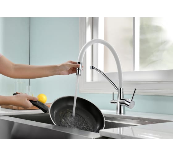 Смеситель оснащен гибким изливом, который удобен для чистки и ополаскивании раковины, а также для наполнения водой больших емкостей.