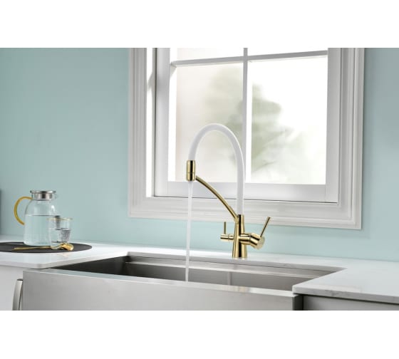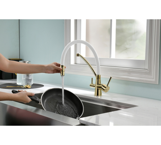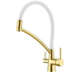 Смеситель для кухни Paulmark Sigen Si213111-Gw золото, белый шланг, резиновый излив изготовлен из прочной и надежной латуни. Латунь не подвержена коррозии, поэтому смеситель прослужит много лет.