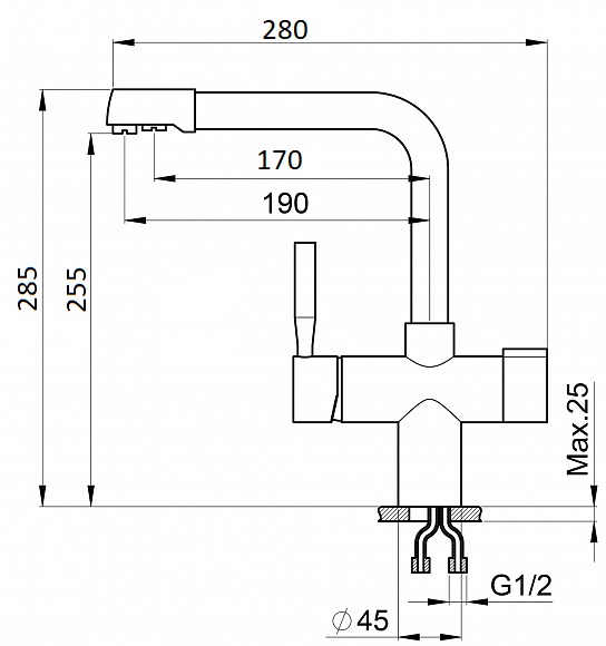 Исполнение излива: монолитный, поворотный, с подключением к фильтру для питьевой воды