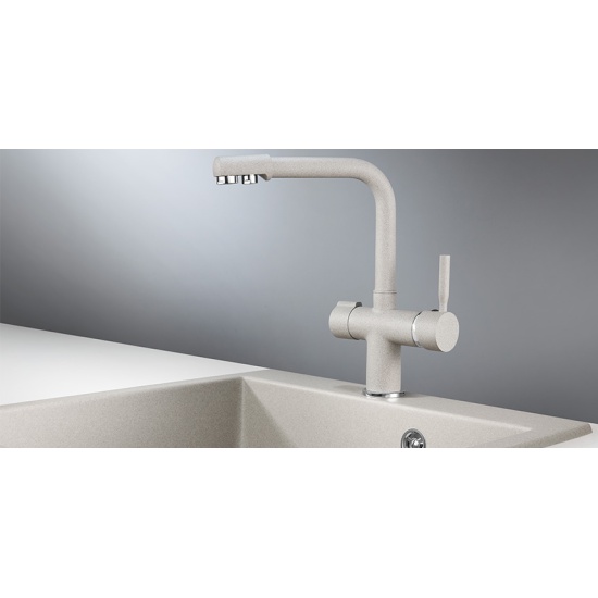 вес 2 кг; максимальная толщина столешницы 25 мм; система подачи питьевой воды активируется при помощи второго рычага, реализована благодаря подаче фильтрованной воды через отдельную трубку