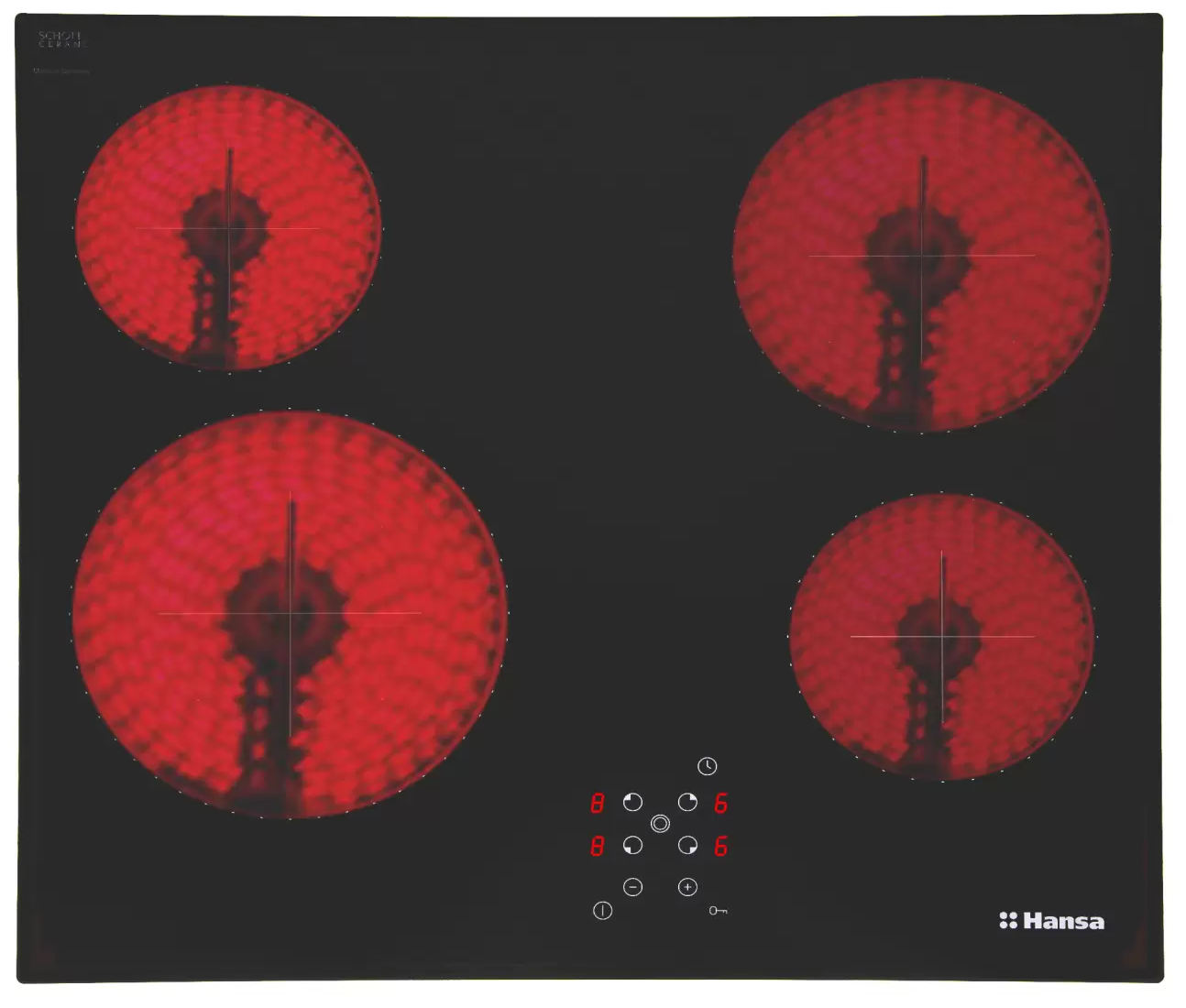 передняя левая зона нагрева 21/12 см, задняя левая зона нагрева 14.5 см, передняя правая зона нагрева 14.5 см, задняя правая зона нагрева 18/12 см