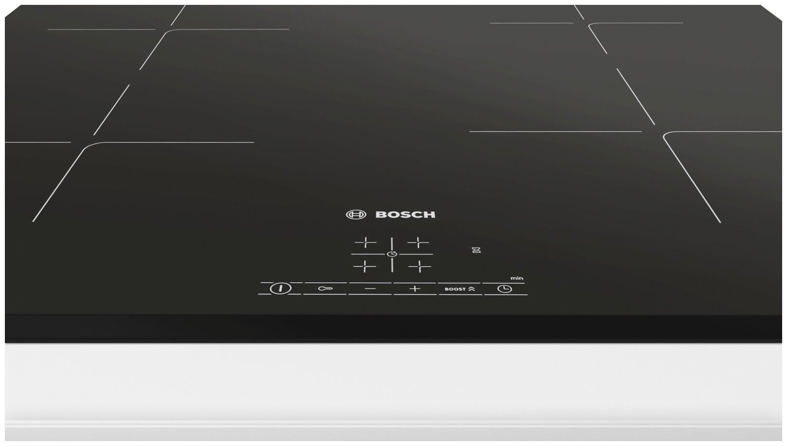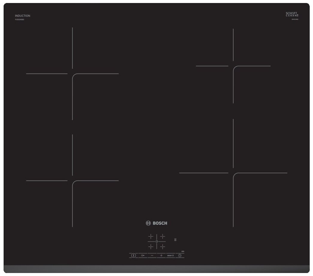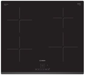 Удобство и функциональность кухни достигается использованием соответствующей бытовой техники. К ней относится и варочная панель Bosch PUE63KBB5E электрическая индукционная, встраиваемая. Она обладает высоким КПД, способна обеспечить один из самых быстрых нагревов. Также варочная панель Bosch PUE63KBB5E имеет стильный дизайн и легко станет отличным дополнением к интерьеру любой кухни. Бытовая техника выполнена в корпусе черного цвета. Основной материал изготовления устройства - стеклокерамика. Это высокопрочный, надёжный и экологически чистый материал. Стеклокерамическая варочная поверхность Bosch PUE63KBB5E превосходно выглядит, ее легко содержать в чистоте. Индукционная варочная панель располагает 4 конфорками. Конфорка передняя левая: 180 мм, 1.8 кВт (макс. мощность 3.1 кВт). Конфорка левая задняя: 180 мм, 1.8 кВт (макс. мощность 3.1 кВт). Конфорка задняя правая: 145 мм, 1.4 кВт (макс. мощность 2.2 кВт). Конфорка передняя правая: 210 мм, 2.2 кВт (макс. мощность 3.7 кВт). Подключаемая мощность: 4600 Вт. Класс энергопотребления - А. Размеры рабочей поверхности - 5,1х59.2х52.2 см (ВхШхГ). Габариты ниши для встраивания - 5,1х56х49см (ВхШхГ). Варочная панель индукционная, особенности и преимущества: интуитивно простое сенсорное управление, функция распознавания наличия посуды, индикатор остаточного тепла, таймер с автоотключением, кабель с вилкой. Основные характеристики. Элегантный привлекательный дизайн со скошенной передней частью. Управление TouchControl: одним прикосновением. Делает управление всеми конфорками и функциями удобным и простым. Достаточно легкого прикосновения к сенсорной панели управления. PowerBoost - максимальная скорость. При готовке порой просто необходимо быстро увеличить нагрев. Усовершенствованная функция PowerBoost, в варочных панелях Bosch, повышает мощность для ускорения процесса нагрева и закипания. Просто включите конфорку и активируйте функцию PowerBoost. С помощью функции reStart варочная поверхность сохраняет все настройки в случае непреднамеренного выключения. Для этого, если случайно отключили прибор главным выключателем, необходимо в течение 4 секунд снова включить варочную панель главным выключателем и тогда все предыдущие настройки восстановятся Чтобы дети не смогли случайно включить прибор или изменить установки, он оборудован специальной функцией "Блокировка от детей". Активация функции блокировки панели управления очень проста - достаточно перевести переключатель выбора функций в нулевое положение. И удерживать нажатой кнопку с изображением ключа 4 секунды. Все просто и ребенок защищен. Таймер с функцией выключения позволяет сделать работу с варочной панелью более удобной. Задайте время приготовления, по истечении которого таймер автоматически отключит выбраную конфорку. При индукционном нагреве тепло генерируется в днище посуды. Сама конфорка почти не нагревается. Это обуславливает преимущества индукционных конфорок: более высокая скорость нагрева, экономичность, нет опасности серьезных ожогов