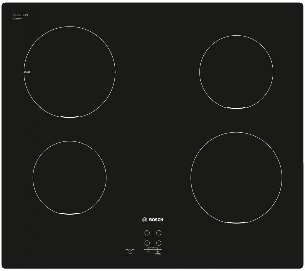 Варочная поверхность Bosch PUG611AA5D черный; ; левая передняя - 14.5 см; правая задняя - 14.5 см; правая передняя - 18 см; индикация включения и уровня мощности; количество степеней мощности - 9; мощность задней левой конфорки - 1800/3100 Вт; мощность задней правой конфорки - 1400 Вт; мощность передней левой конфорки - 1400 Вт; мощность передней правой конфорки - 1800 Вт; напряжение питания 220/240 В; длина кабеля питания - 1.1 м
