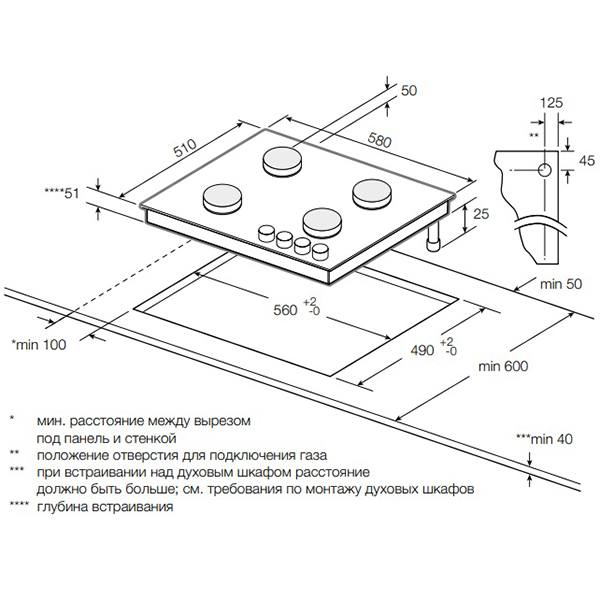 |  |  | | Общие характеристики | | Рамка | отсутствует | | Решетки конфорок | чугунные | | Габариты (ШхГ) | 58x51 см | | Размеры для встраивания (ШхГ) | 560x490 мм |