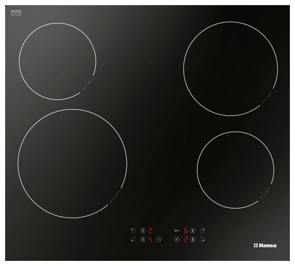передняя левая зона нагрева 21 см; передняя правая зона нагрева 14,5 см; задняя левая зона нагрева 14,5 см; задняя правая зона нагрева 18 см