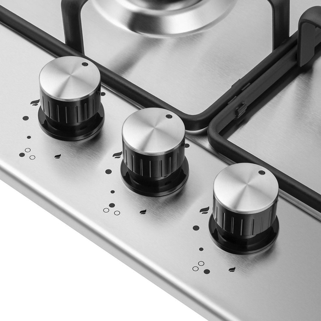 Особенности: без газ-контроля, конфорки ALBEK (с матовыми крышками), ручки управления - круглые пластиковые (ножка - чёрная, крышка - хромированная)
