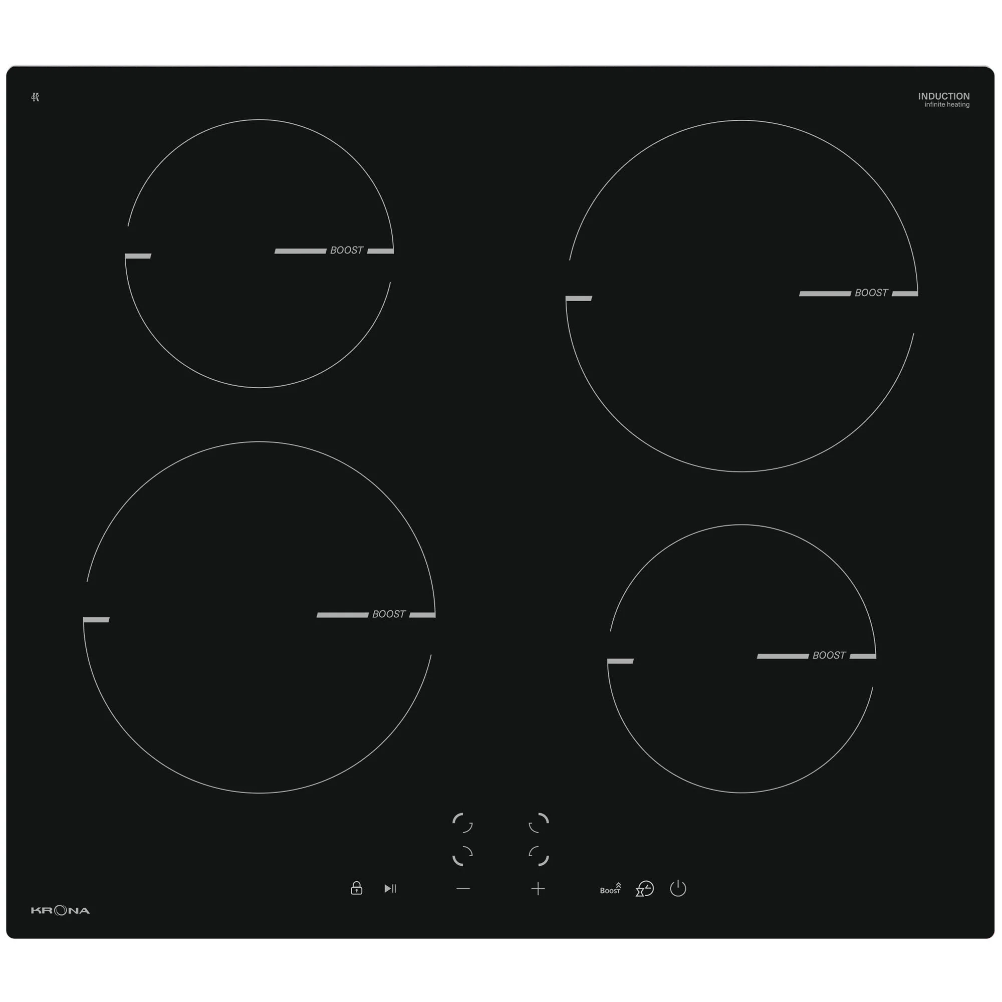 Удобное слайдерное управление Touch Slider. Функция паузы Stop&Go. Непрерывный нагрев Infinite heating. Таймер до 99 минут. Усилитель нагрева Booster на 4 зоны.