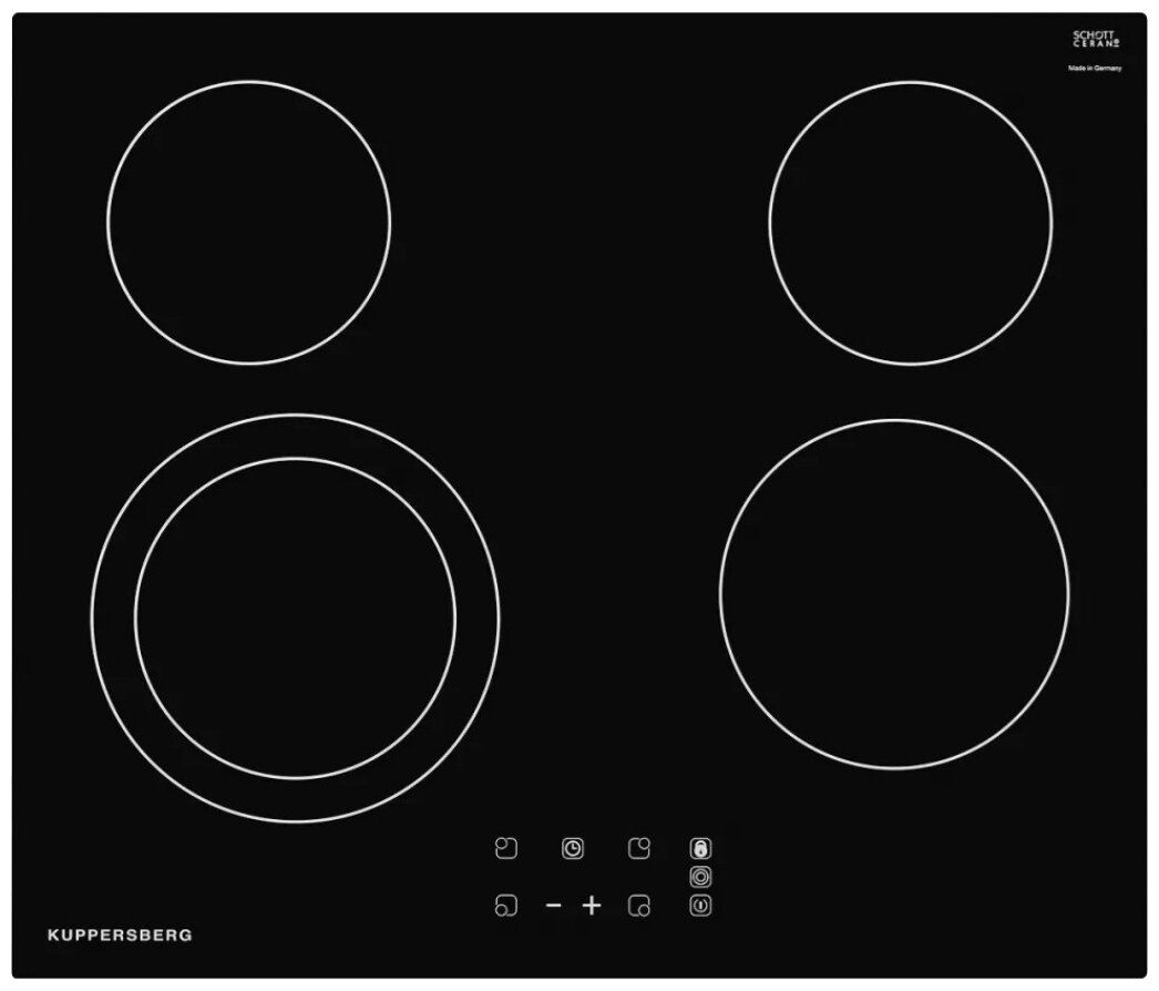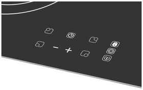мощность конфорок: передняя левая 180−210 мм/1,4−2 кВт, передняя правая 180 мм/1,8 кВт, задняя левая 145 мм/1,2 кВт, задняя правая 145 мм/1,2 кВт; 5 цифровых дисплеев; 9 уровней мощности