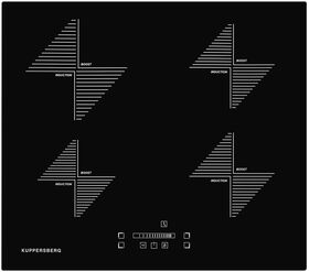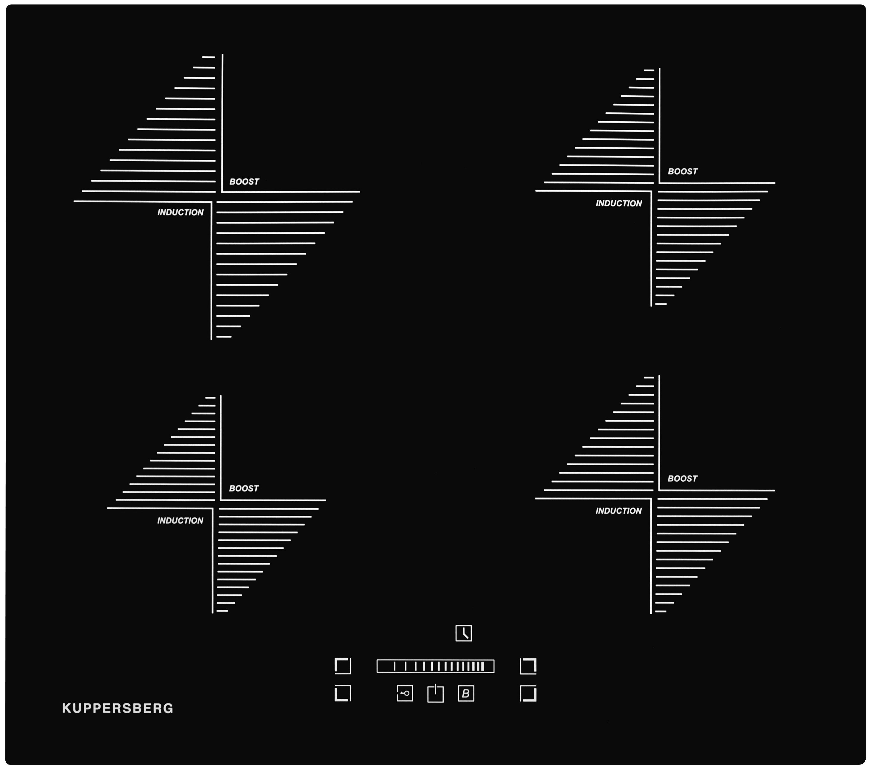 мощность передней правой и задней правой конфорок: 1.8 кВт (Booster 2 кВт), мощность передней левой конфорки: 1.4 кВт (Booster 1.5 кВт), мощность задней левой конфорки: 2.4 кВТ (Booster 2.6 кВт); 5 цифровых дисплеев; 9 уровней мощности
