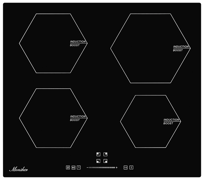 9-ступенчатая настройка мощности; 5 цифровых дисплеев; режим Boost; мощность конфорок: передняя левая 2,0 кВт / BOOSTER 2,6 кВт; передняя правая 1.5 кВт / BOOSTER 2,0 кВт; задняя левая 1.5 кВт / BOOSTER 2,0 кВт; задняя правая 2.0 кВт / BOOSTER 3,0 кВт