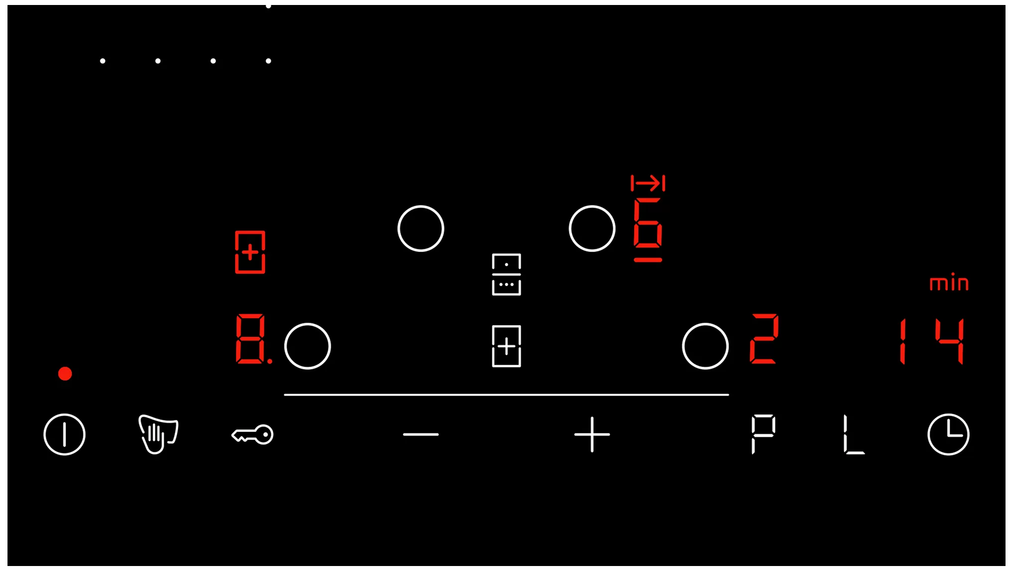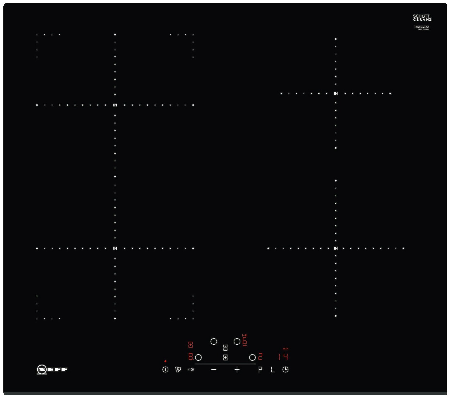 защитное отключение конфорок, индикатор остаточного тепла, кнопка блокировки панели