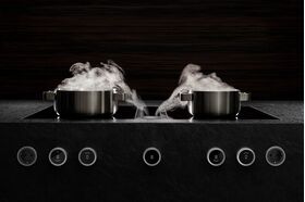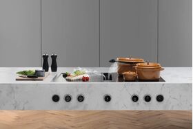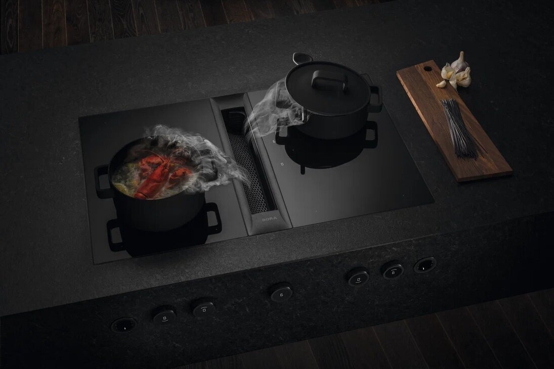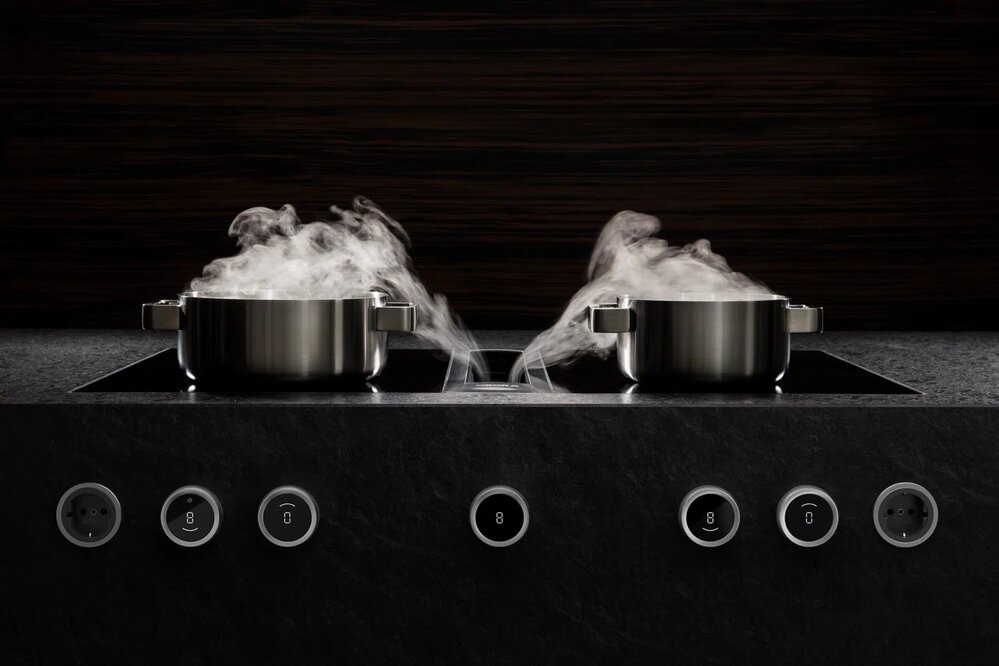 Встраиваемая в столешницу вытяжка с вентилятором PKAS3AB, черная (1 шт.) Cплошная индукционная варочная панель All Black PKFI3AB (2 шт.) Угловой соединительный элемент, угол 90° в вертикальной плоскости EFBV90 (1 шт.) Плоский канал ecotube с отделениями,
