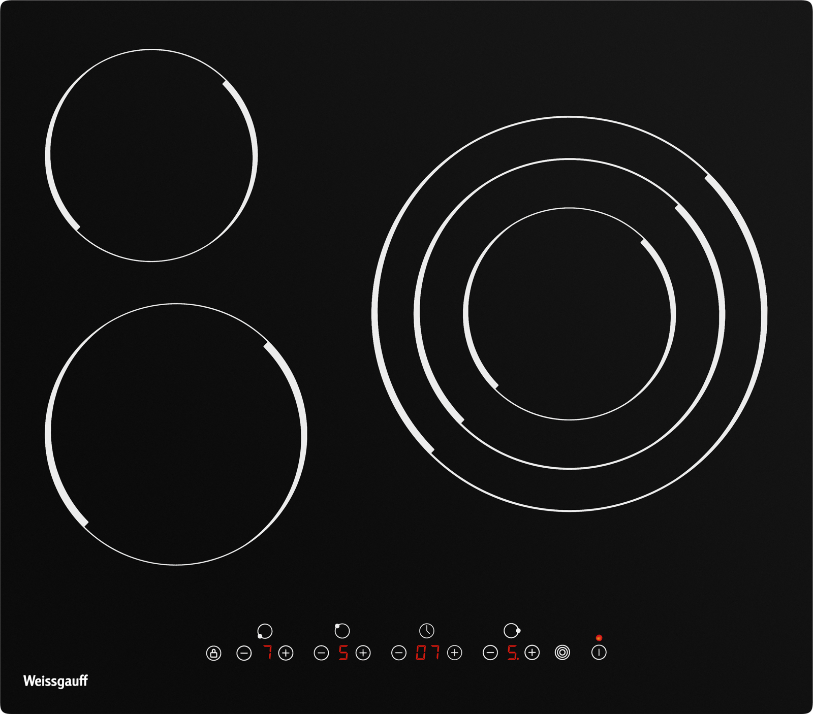 Конфорки: 3 конфорки: 1x 165 мм*1,2 кВт (задняя левая), 1х 200 мм*1,8 кВт (передняя левая), 1 х 140/210/300 мм*1,05/1,95/2,7 кВт (тройной контур)