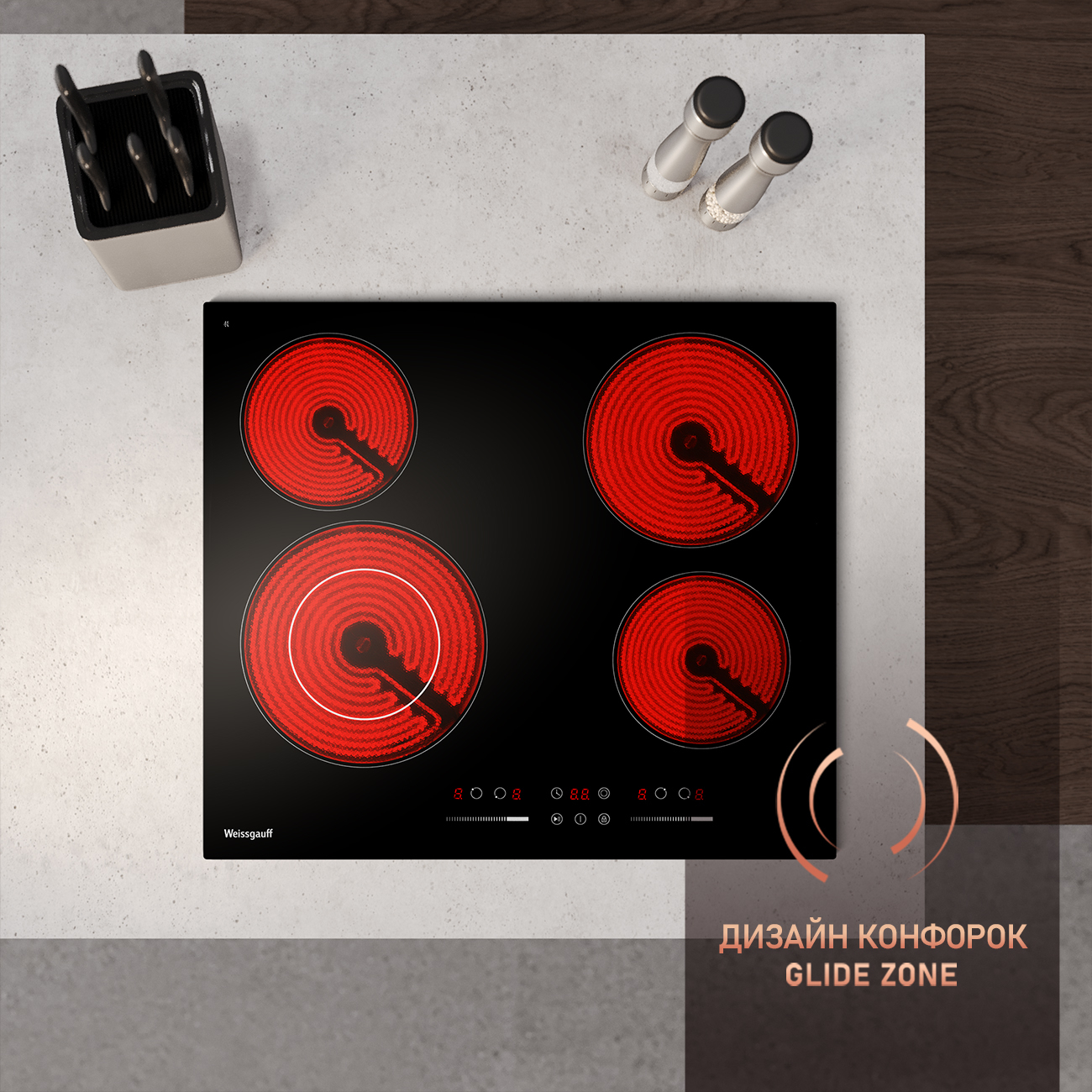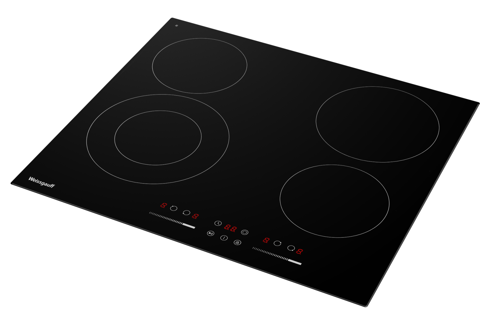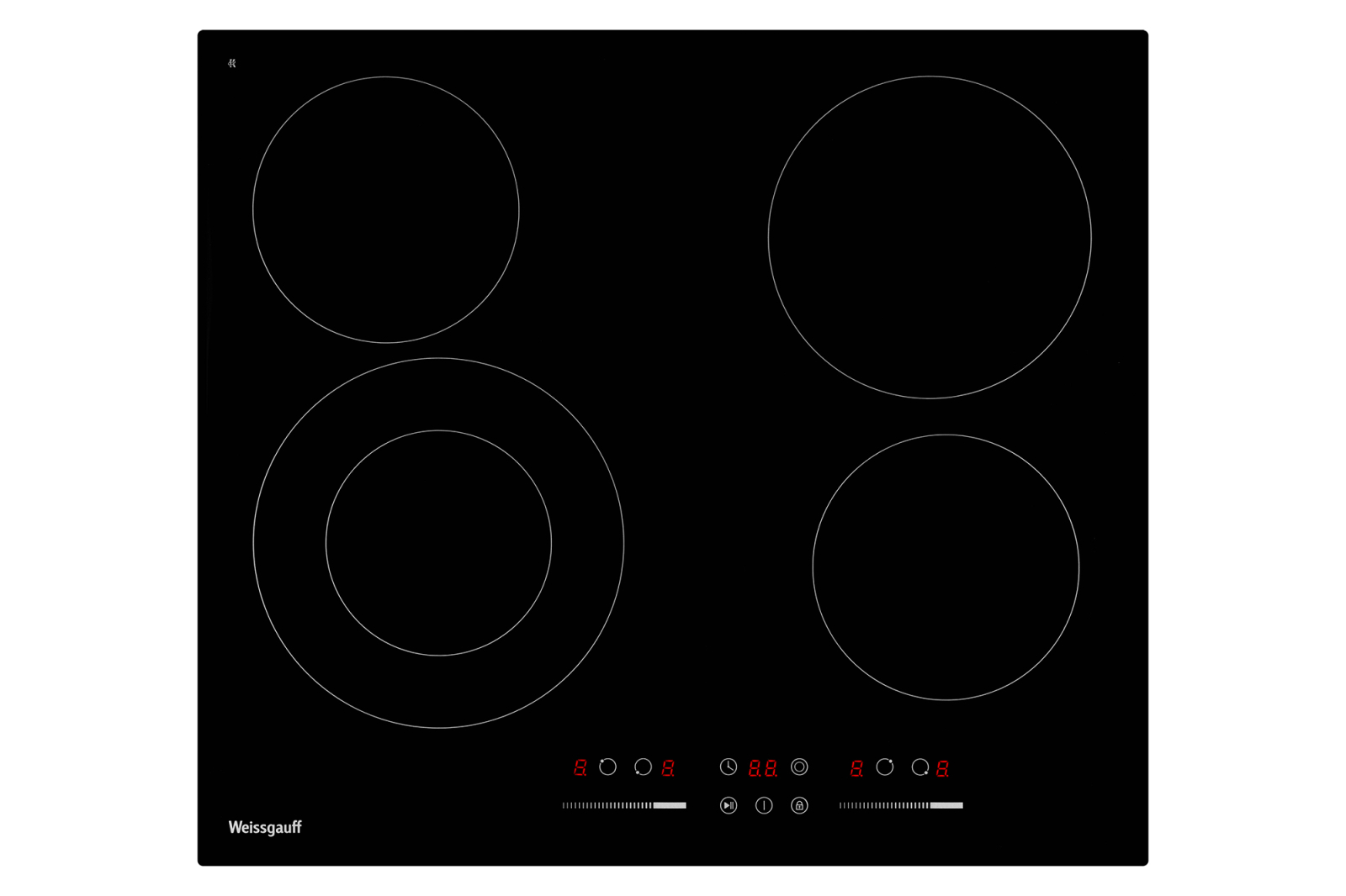 Конфорки: 4 конфорки: 1x 230/138 мм*2,2/1.1 кВт (двойной контур), 1х 200 мм*1,8 кВт, 2х 165 мм*1,2 кВт