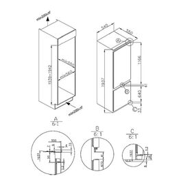Корпус шириной 54 см сделан из металла. Внутренняя часть выполнена из антибактериального белого пластика легкой очистки. Предусмотрена возможность перенавешивания дверей.В верхней холодильной камере находятся: