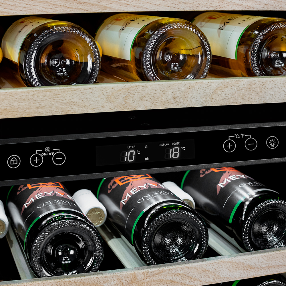 Компрессорный винный шкаф Meyvel MV46PRO-KWT2 обладает большой вместимостью и даёт возможность разместить до 46 бутылок стандартного типа Бордо (0,75 л). Располагаются они на выкатных полках из дерева. Внутреннее пространство шкафа разделено на 2 температурные зоны, с возможностью настраивать каждую из них. Диапазон верхней зоны варьируется от +5°C до +12°C, а нижней - от +12°C до +20°C.