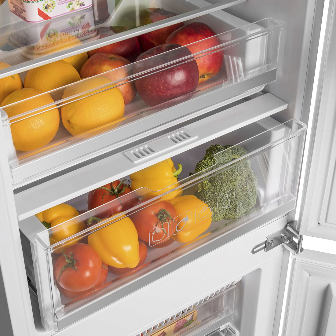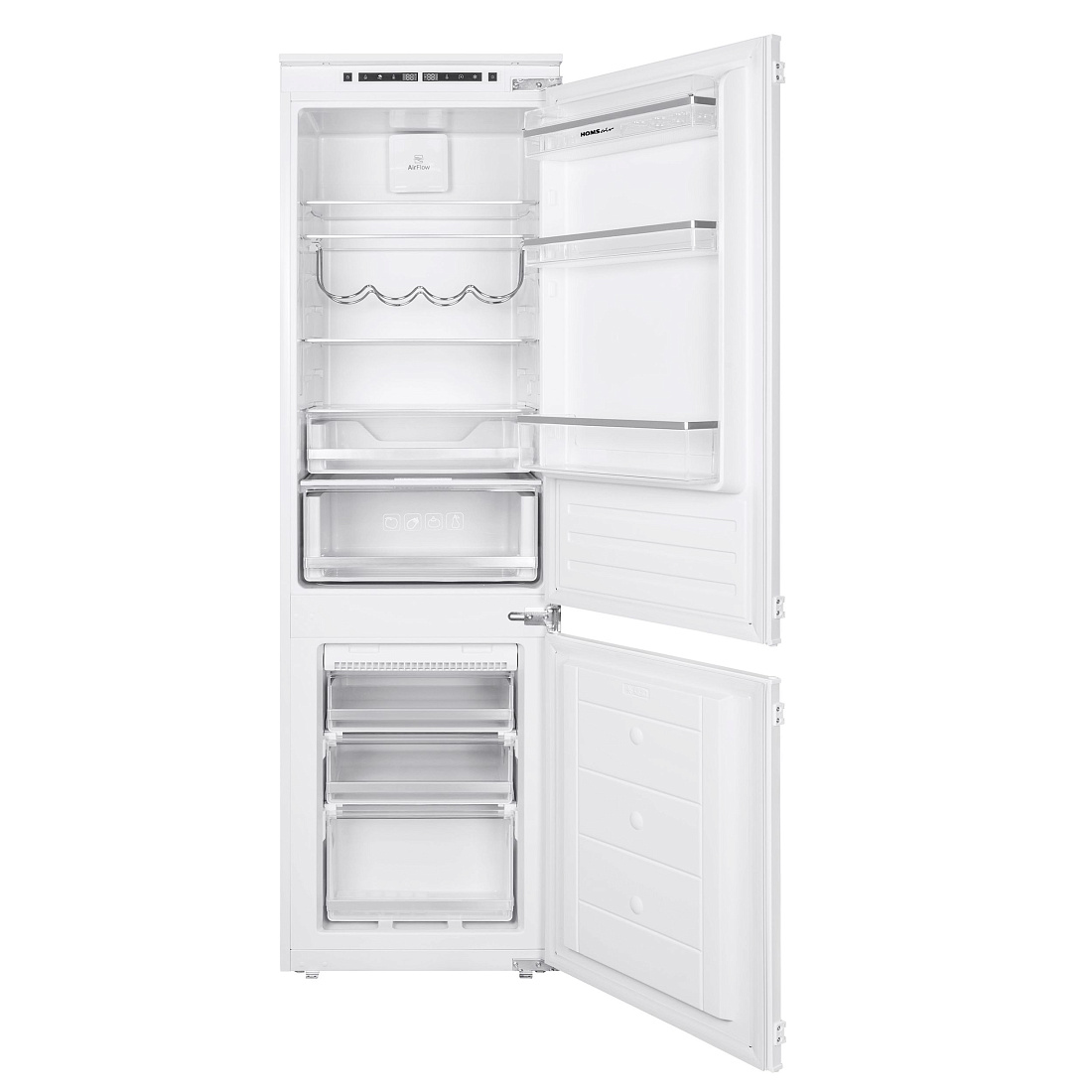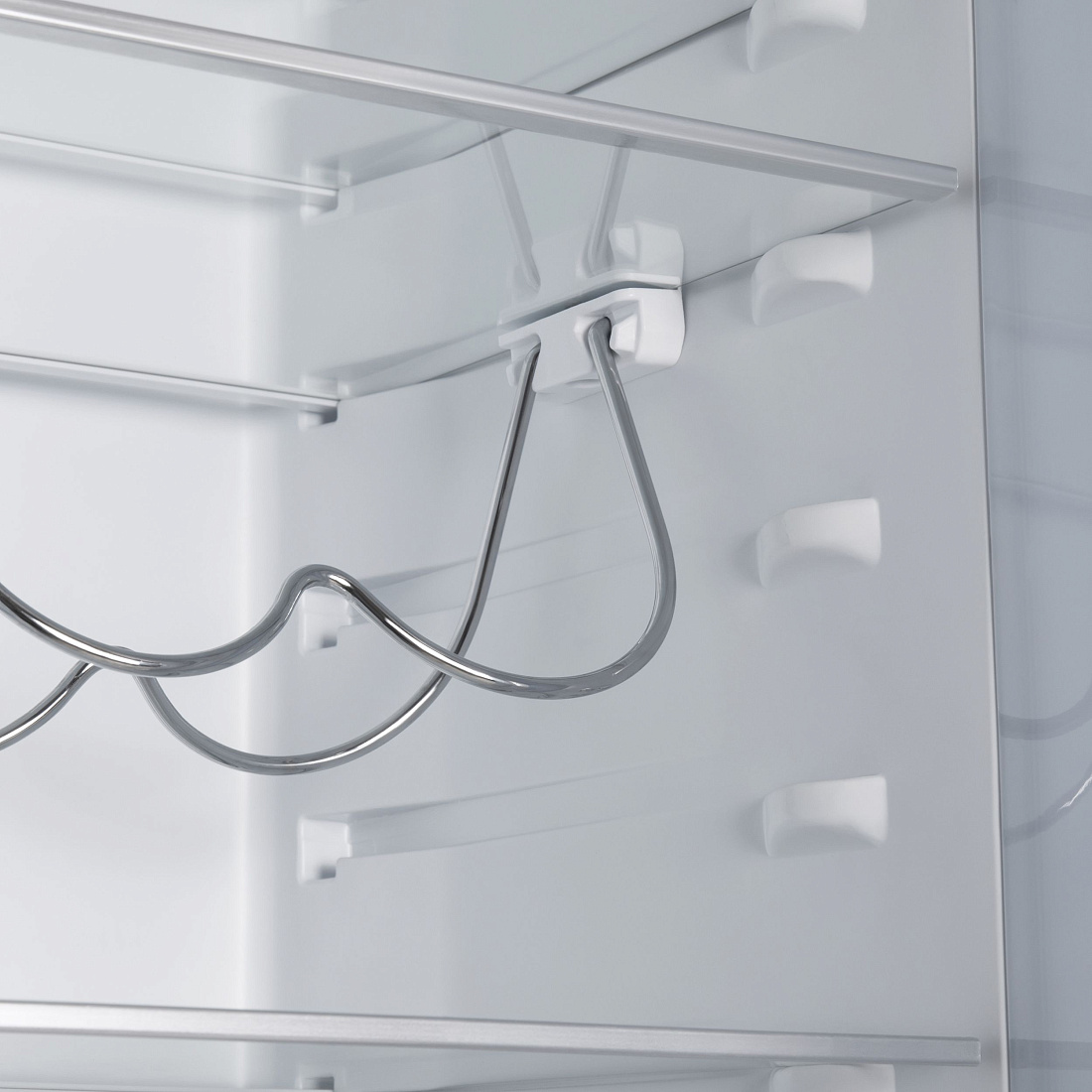 Полки из закаленного стекла, ящики в холодильной и морозильной камере, полки на двери, решетка для бутылок, формочка для льда.