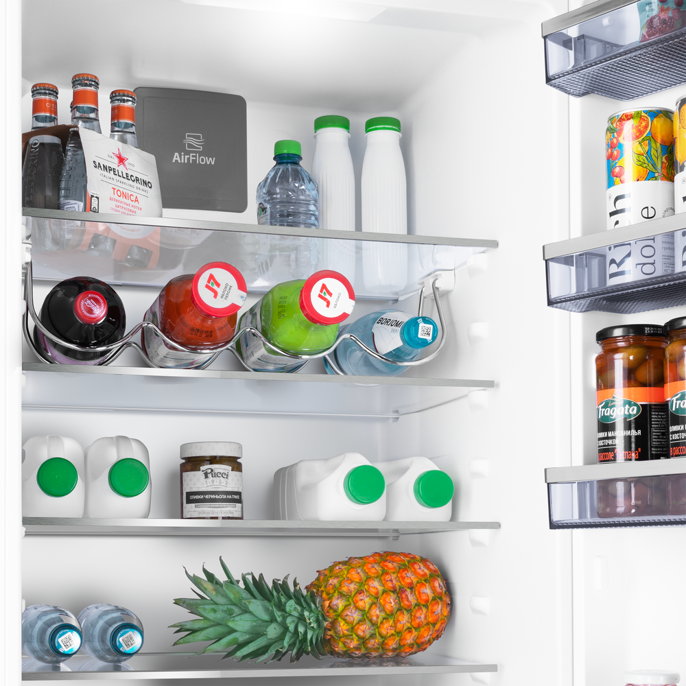 Особенностью этой модели является система NoFrost в морозильном отделении, которая предотвращает образование инея и обледенения. Это значительно упрощает процесс эксплуатации и обслуживания устройства. Также стоит отметить наличие электронного управления и сенсорных переключателей, что делает использование холодильника максимально удобным и простым. Внутри холодильника предусмотрены четыре полки из закаленного стекла, регулируемые по высоте, два ящика для овощей и фруктов, а также четыре полки на двери. В морозильном отделении расположены три ящика, что позволяет разместить продукты максимально рационально. Внутренняя подсветка обеспечивает отличное освещение, позволяя легко найти необходимые продукты. Устройство оборудовано дисплеем и системой электронной регулировки и контроля температуры. Звуковая индикация открытой двери поможет избежать ненужного потепления внутренних отделений.